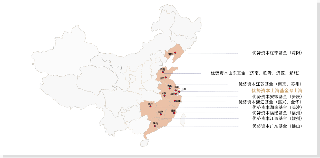 優(yōu)勢資本投資和產(chǎn)業(yè)資源覆蓋了全國大部分省市,并與遼寧、山東、江蘇、安徽、浙江、湖南、福建、江西、廣東等省、市地方政府及地方平臺先后設(shè)立了產(chǎn)業(yè)基金,打通各地產(chǎn)業(yè)資源。